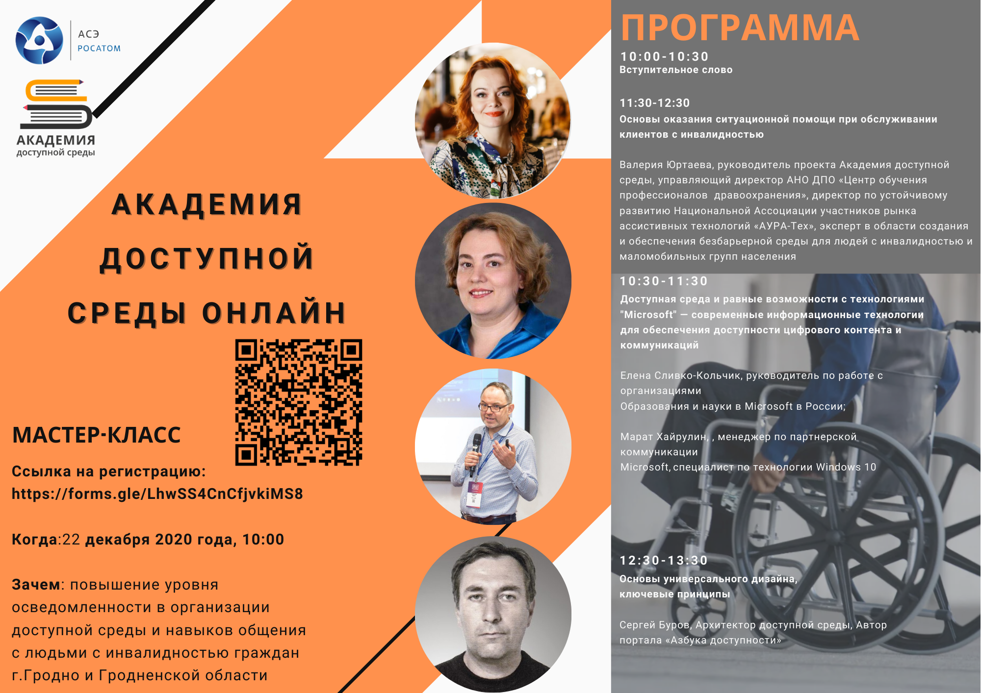 Каждый слушатель вебинара получит сертификат о прохождении курса от «Академии доступной среды Онлайн». Участие в мероприятии бесплатное, по предварительной регистрации: https://forms.gle/LhwSS4CnCfjvkiMS8
